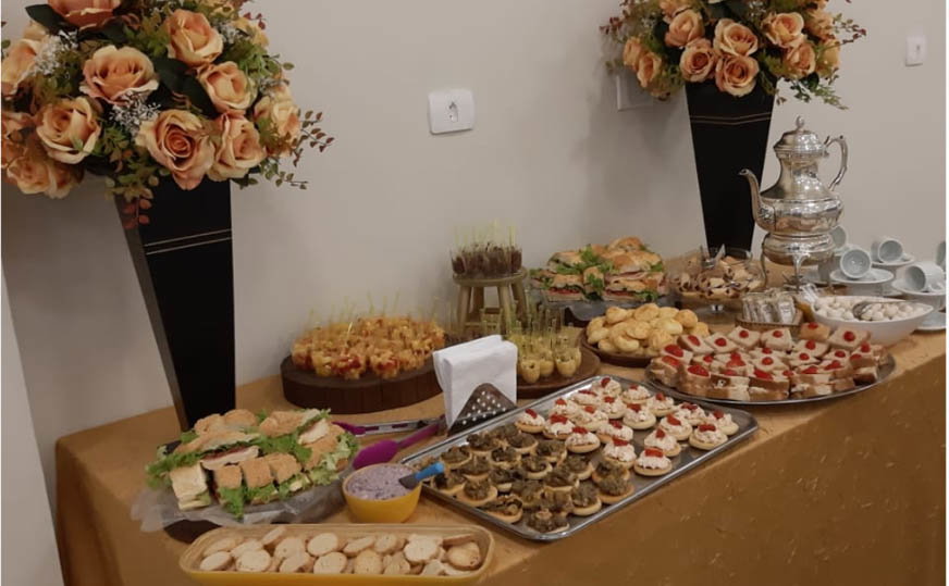 ENTRADA -Petit four salgado - Licor e refrigerante MINI SALGADOS (todos os salgados são fritos na hora) Coxinha de frango tradicional bolinho de queijo Risole de presunto e queijo pastel de queijo pastel de carne MINI SALGADOS ASSADOS esfiha de carne esfiha de frango Minipizza de mussarela LANCHE DE METRO BEBIDAS (1ºlinha) Água com/sem gás suco Coca cola versão normal e zero guaraná Cerveja DOCES Brigadeiro Beijinho BOLO Abacaxi Morango Prestígio Doce de leote MESA DE ENCERRAMENTO Cafe Chá Petiti four doce DECORAÇÃO de flores naturais
